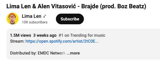 Na hrvaški lestvici najbolj poslušanih pesmi na YouTubu so te dni sicer na vrhu lestvice Baka prase, Breskvica in Jala Brat & Buba, sta se Lima Len & Alen Vitasović s hitom Brajde uvrstila na 7. mesto.