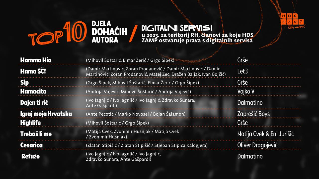 Hrvaška agencija za avtorske pravice ZAMP je razkrila, kateri glasbeniki in glasbenice so bili najbolj poslušani v lanskem letu na Hrvaškem.