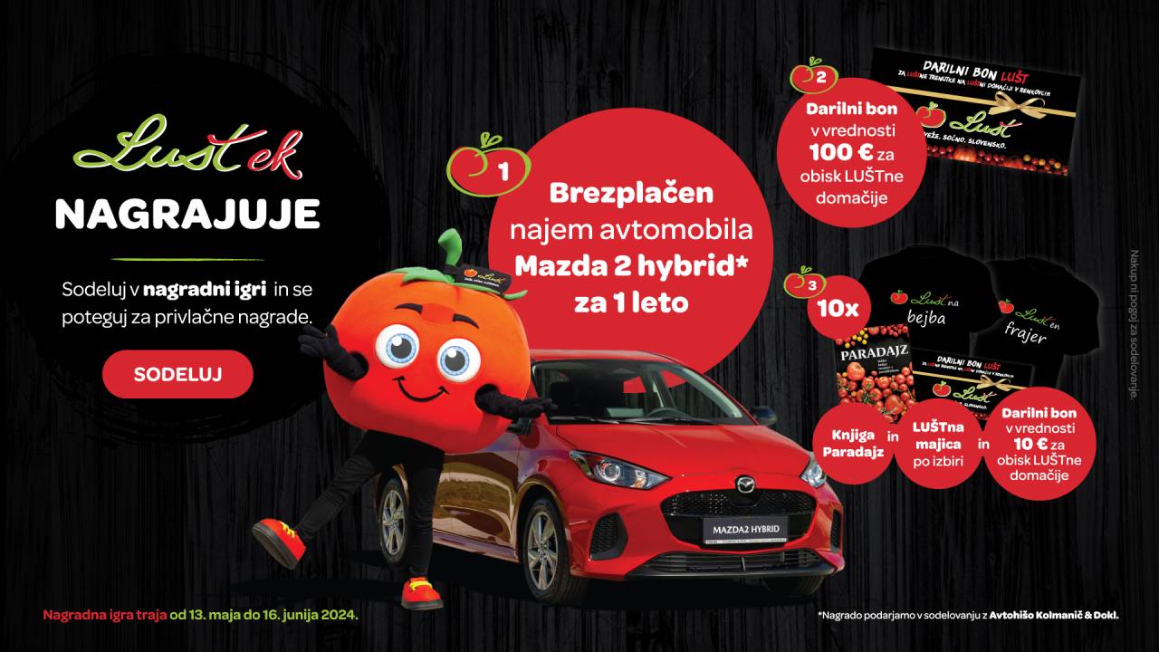 LUŠTek nagrajuje! ZaLUŠTajte si paradižnik LUŠT in z malo sreče postanite LUŠTen/na voznik/ca nove Mazde 2 hybrid* za eno leto ali se potegujte za druge privlačne nagrade! Naložite račun, iz katerega je razviden nakup paradižnika LUŠT v skupni vrednosti najmanj 5,00 evrov z davkom na dodano vrednost, ali napišite zgodbo dolžine od 500 do 1500 znakov brez presledkov z naslovom »ZaLUŠTam si paradižnik LUŠT«.