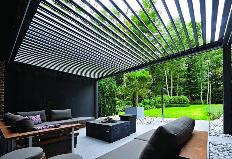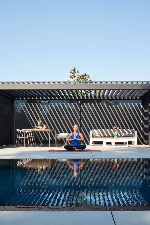 Strešna pergola z lamelami je osupljiva prostostoječa zunanja konstrukcija s streho, ki se lahko odpre ali zapre s pritiskom na gumb. Čeprav je v svoji zasnovi preprosta, elegantna struktura in brezčasen slog pergole polepšata vrt in ustvarita popoln kotiček za sončenje poleti.