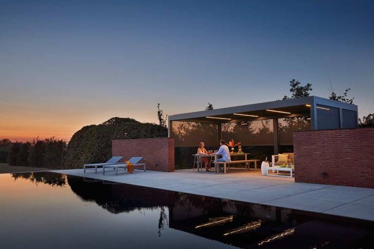 To je zato, ker lahko dodate zložljivo streho in drsne stene iz stekla od tal do stropa, ki ustvarijo popolnoma zaprt ali odprt prostor, odvisno od vaših potreb in vremena.