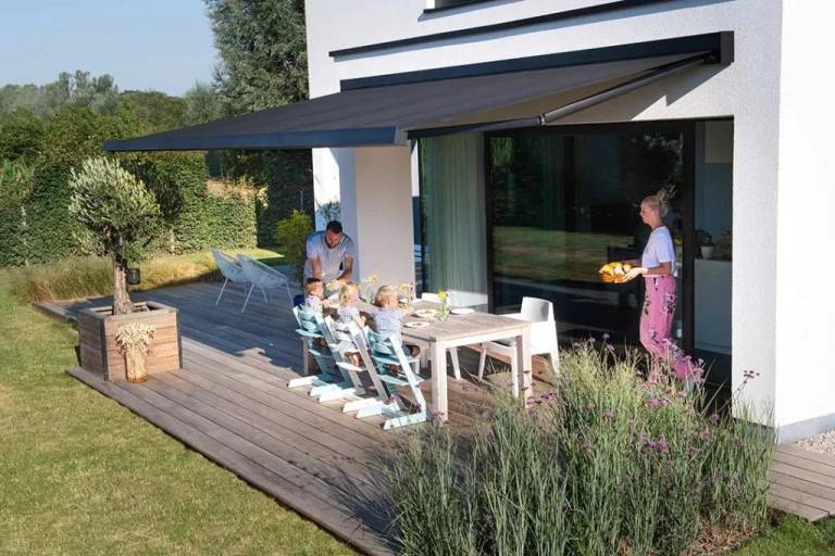 Če želite ustvariti senčen kotiček na svojem vrtu, vendar želite nekaj bolj skromnega od pergole ali vrtne strukture, je tenda odlična izbira. Streho markize, ki je lepo spravljena v diskretni kaseti, je mogoče v nekaj trenutkih podaljšati ali umakniti.