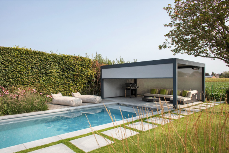 Pergolo lahko uporabite kot hišico ob bazenu za sprostitev in celo shranjevanje plavalne opreme.