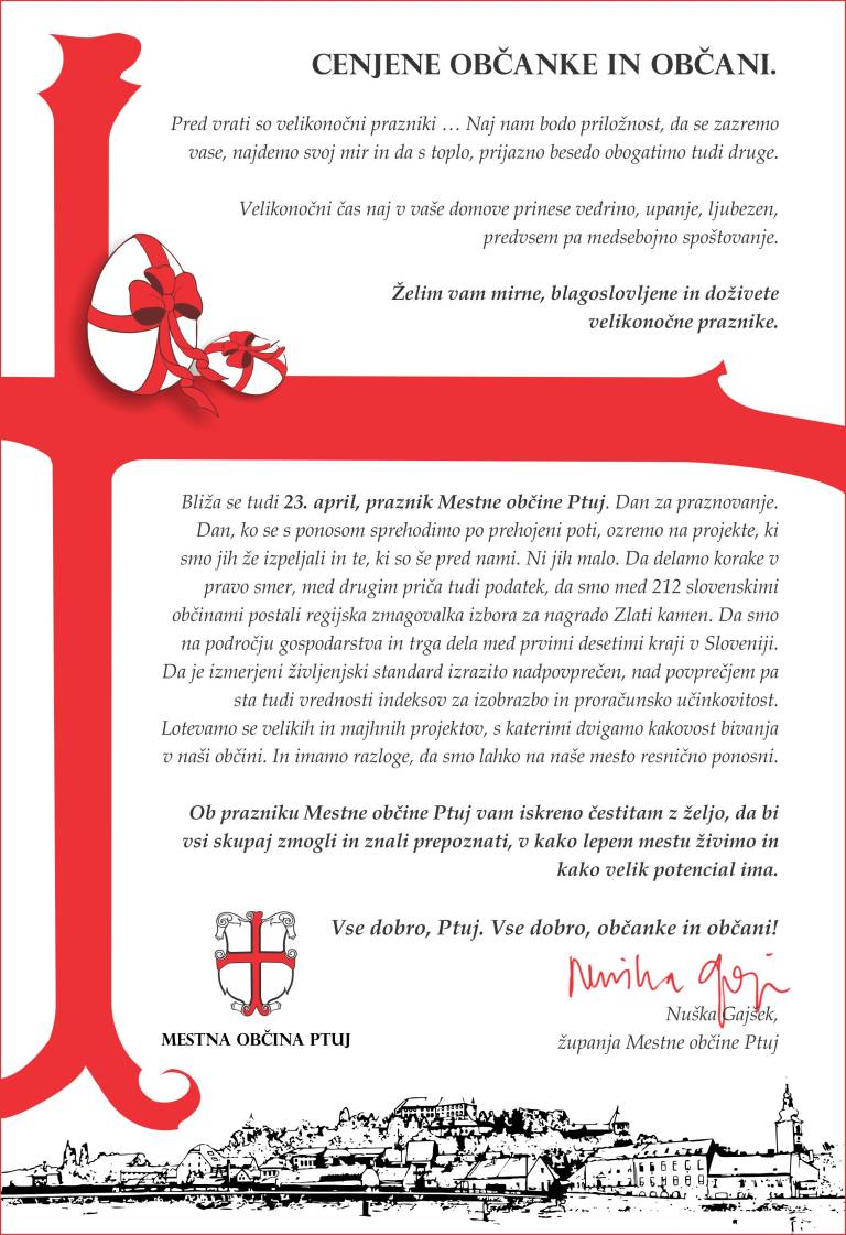 Velikonočno voščilo županje Oglasni prispevek | 17. april 2025 07:00 v Scena Foto: Stanko Kozel Nuška Gajšek, županja Mestne občine Ptuj, vsem občankam in občanom želi mirne in blagoslovljene velikonočne praznike.