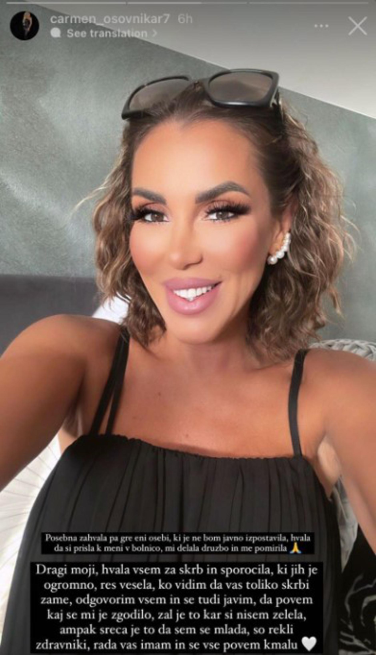 »Dragi moji, hvala vsem za skrb in sporočila, ki jih je ogromno. Res sem vesela, ko vidim, da vas toliko skrbi zame, odgovorim vsem in se tudi javim, da povem, kaj se mi je zgodilo, žal je to, česar si nisem želela, ampak sreča je to, da sem še mlada, so rekli zdravniki, rada vas imam in vse povem kmalu,« je zapisala Carmen Osovnikar na družbenem omrežju Instagram.