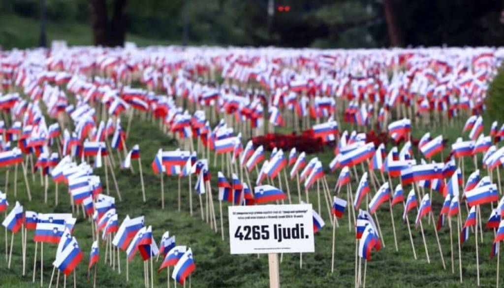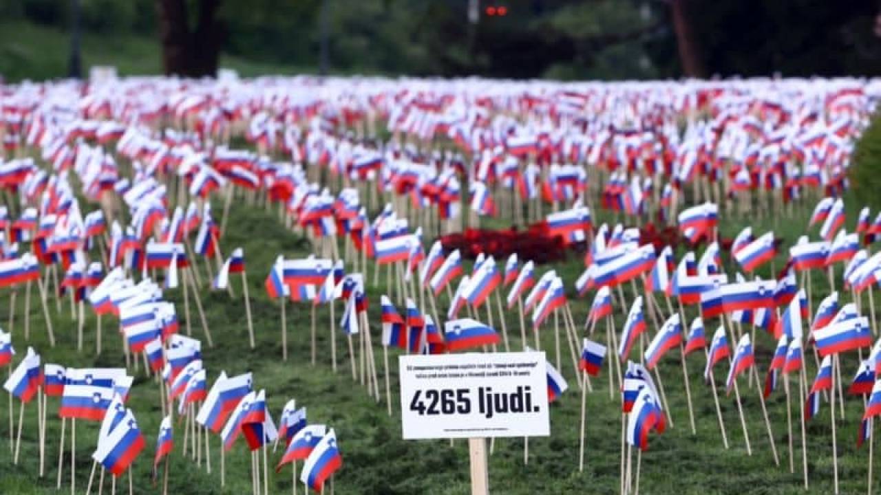 V parku Tivoli se je danes pojavilo 4265 slovenskih zastavic, ki naj bi predstavljale ljudi, ki so v zadnjem letu izgubili življenje zaradi koronavirusa.