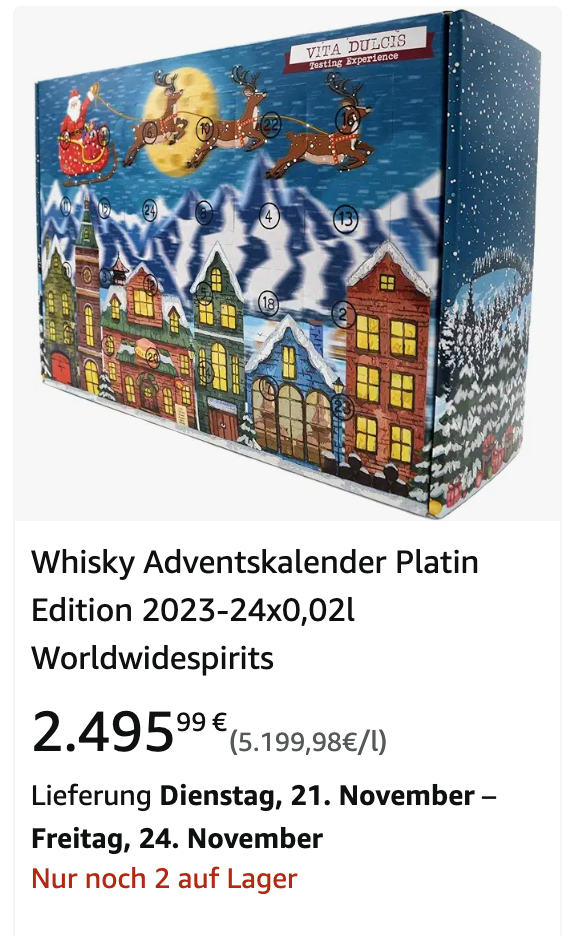 Tudi najdražji adventni koledar, ki ga ponuja nemški spletni trgovec Amazon.de, vsebuje žgane pijače in stane kar 2495,99 evrov.