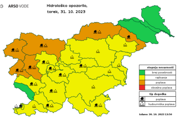 Arso zaradi nalivov izdal oranžno opozorilo za severozahodno in jugovzhodno Slovenijo.