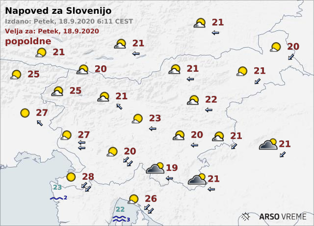 Po napovedih meteorologov Agencije Republike Slovenije za okolje se bo danes, 18. septembra 2020, povsod postopno zjasnilo. Najkasneje se bo to zgodilo na jugovzhodu države, kjer lahko zjutraj še rahlo dežuje.