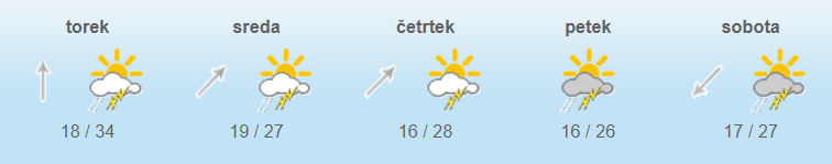 Zvečer bo zahodno Slovenijo dosegla vremenska fronta z nevihtami, ki se bodo ponoči razširile nad večji del države. Možna bodo krajevna neurja. Jutranje temperature bodo od 15 do 20 stopinj Celzija.
