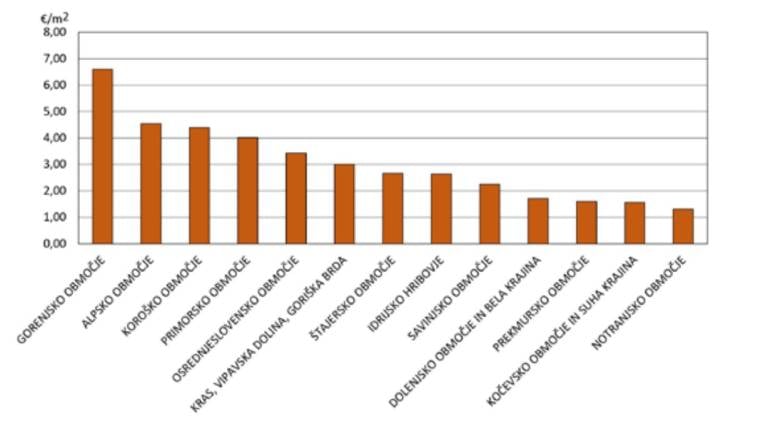 Med večjimi kmetijskimi območji so bile najvišje cene na osrednjeslovenskem območju (3,43 evra na kvadratni meter), sledijo Štajerska (2,67 evra) in Savinjska regija (2,26 evra).