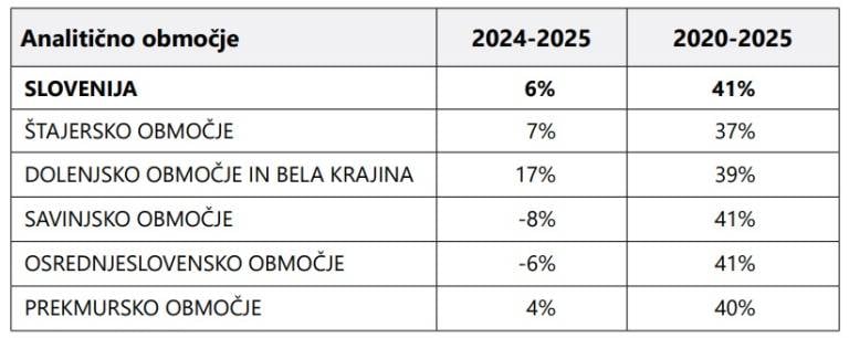 Najnižjo rast cen v tem obdobju so zabeležili na štajerskem območju, kjer so se cene zvišale za 37 odstotkov.