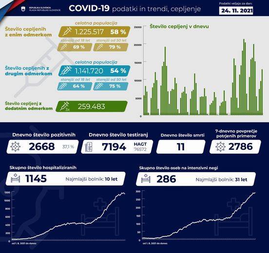 Trenutno je po podatkih Covid-19 Sledilnika v bolnišnicah hospitaliziranih 1145 covidnih bolnikov, od tega je 286 pacientov na intenzivni negi.