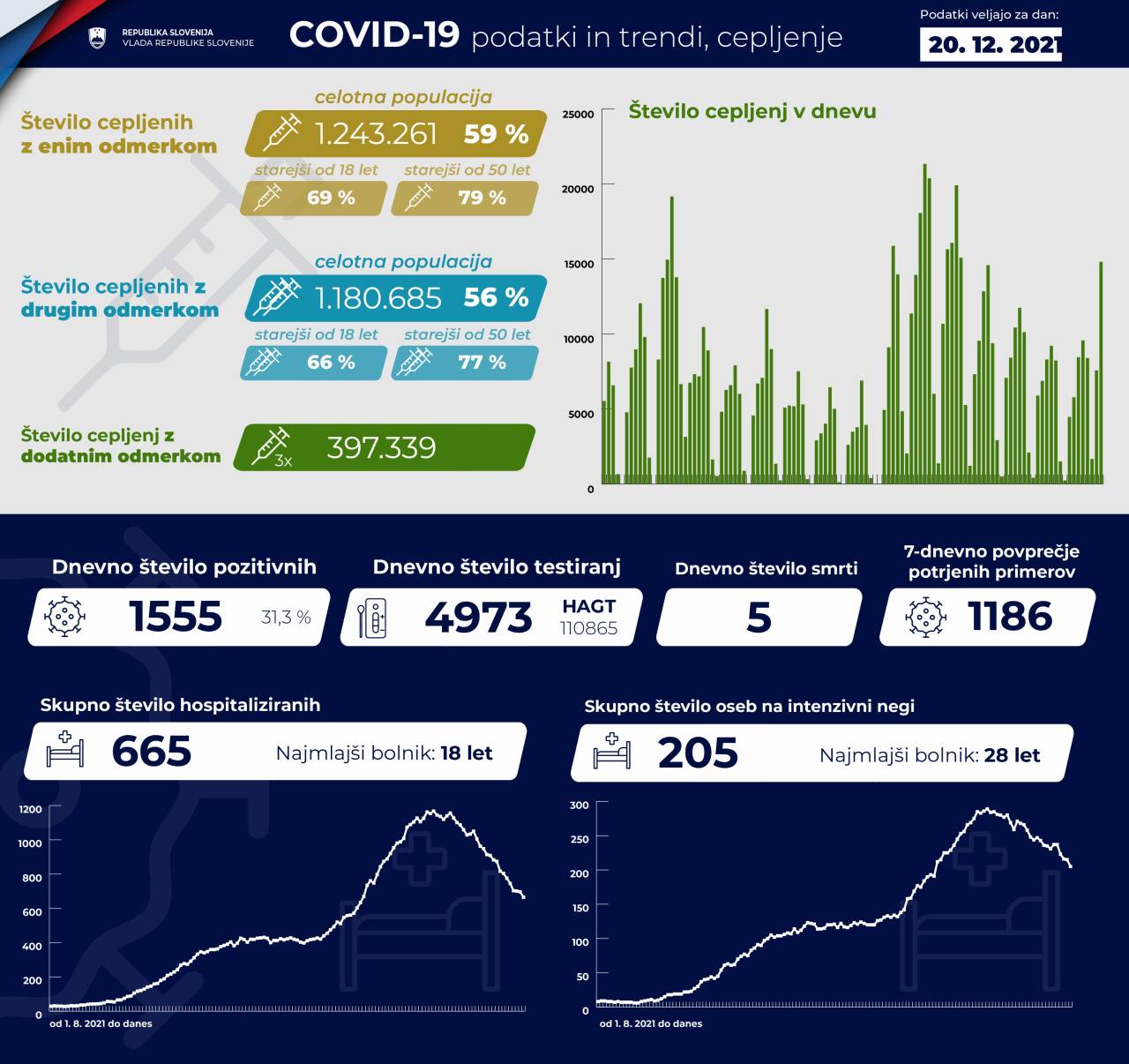 V Sloveniji so včeraj, 20. decembra, opravili 4973 PCR testiranj na koronavirus in potrdili 1555 novih okužb, gre za 31,3-odstotni delež okužb.