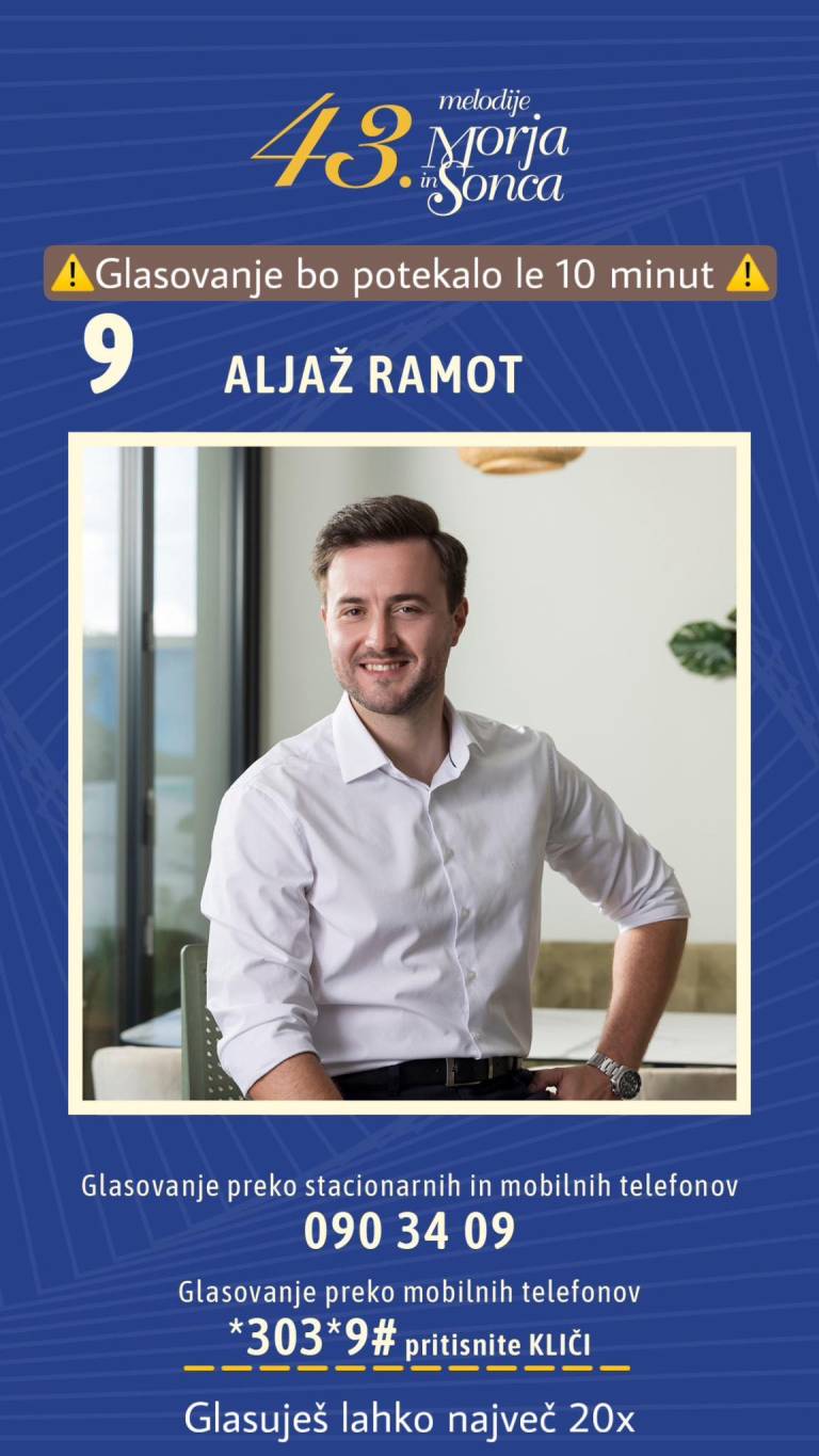 Ptujčan Aljaž Ramot bo danes nastopil na 43. Melodijah morja in sonca z balado 'Lebdiva'. Zanj lahko glasujete s številko devet. Glasovanje bo potekalo le 10 minut.