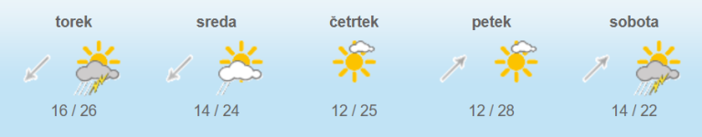 Najnižje jutranje temperature bodo od 11 do 16, na Primorskem okoli 19, najvišje dnevne od 20 do 24, na Primorskem okoli 28 stopinj Celzija.