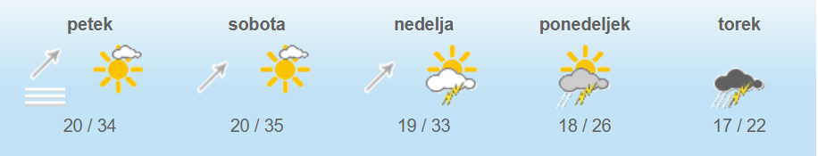 Čez dan bo ponekod zapihal jugozahodnik. Najvišje dnevne temperature bodo od 30 do 36 stopinj Celzija.