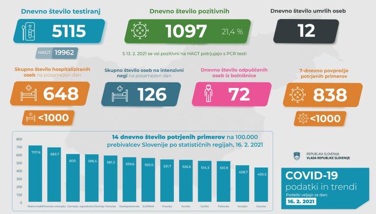 V Sloveniji so včeraj, 16. februarja, opravili 5115 PCR testiranj na koronavirus in potrdili 1097 novih okužb, gre za 21,4-odstotni delež okužb.