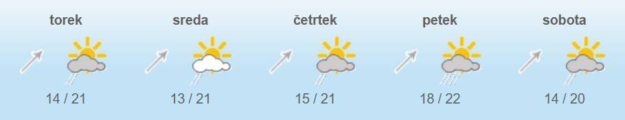 Čez dan bo spremenljivo oblačno z nekaj krajevnimi plohami. Ponekod bo pihal jugozahodni veter. Najvišje dnevne temperature bodo od 17 do 22, v Zgornjesavski dolini okoli 15 stopinj Celzija.