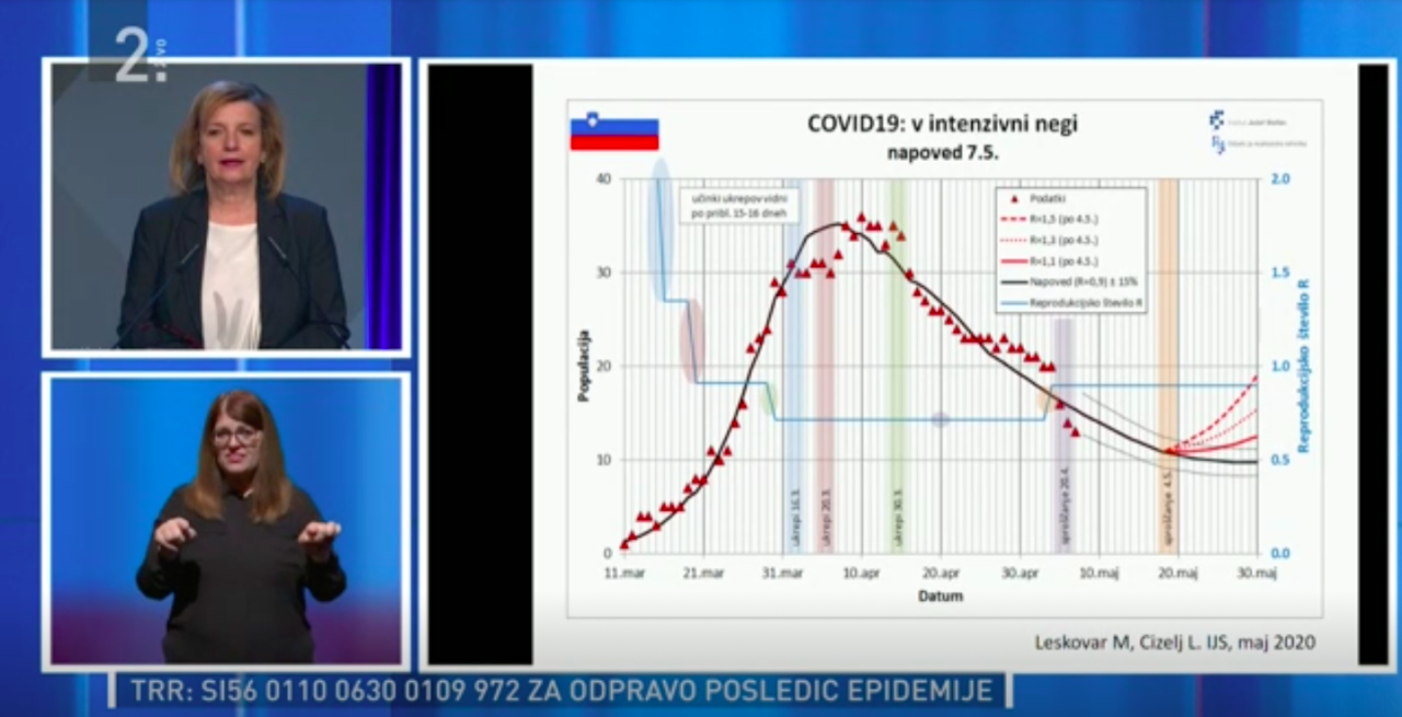 Vodja svetovalne skupine v okviru ministrstva za zdravje Bojana Beovič je predstavial grafa, ki prikazujeta število bolnikov, ki so hospitalizirani v slovenskih bolnišnicah zaradi bolezni covid-19: »Situacija se lepo postopno umirja in razvidno je, kako to umirjanje korelira z našimi 'neprijetnimi' ukrepi. V začetku aprila in konec marca se je to naraščanje sicer nekoliko umirilo, krivulja se je sploščila, a bili smo v zelo neprijetni situaciji - v državi smo imeli ukrepe, za katere smo vedeli, da z njimi ne moremo živeti dolgoročno, po drugi strani pa epidemije ne uspemo obrniti nazdol. Šele, ko so bili sprejeti zadnji ukrepi konec marca, se je krivulja obrnila.«
