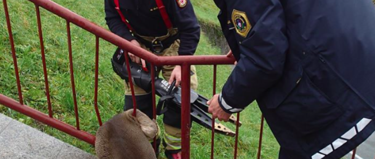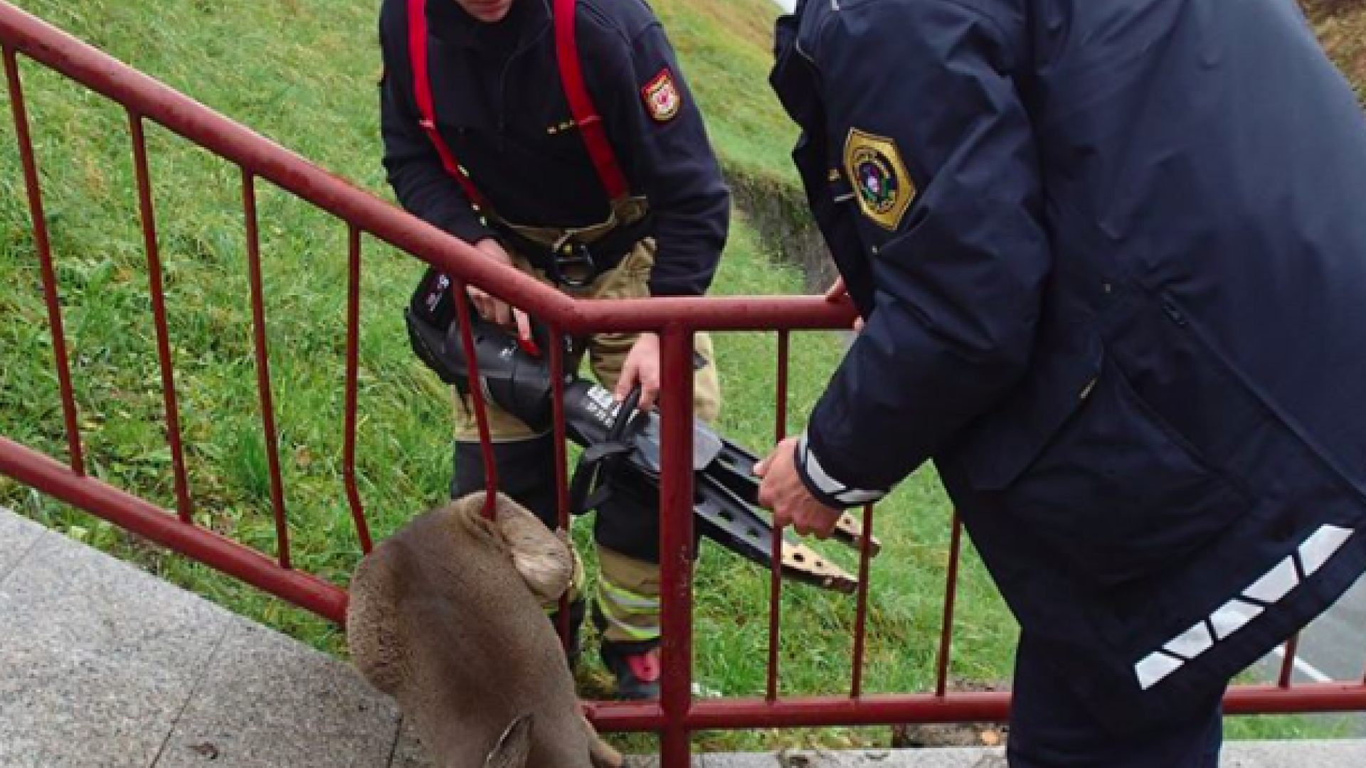 Ganljivo. Policisti in gasilci so opazili in pomagali rešiti srnico, ki se je ujela v ograjo ob cesti.