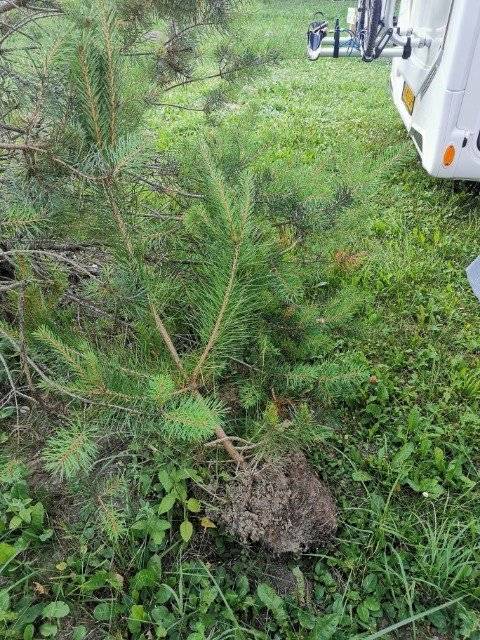 Pri postavljanju avtodoma na mesto v kampu ga je zmotil borovec. Namesto, da bi avtodom postavil drugače, je izruval borovec.