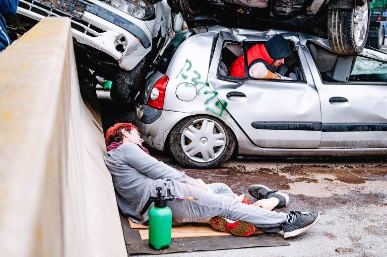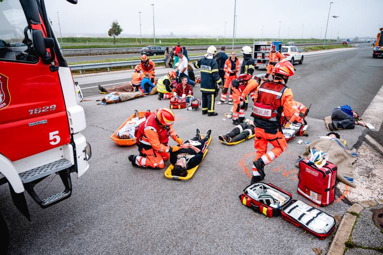 Organizacijska enota Nujne medicinske pomoči Zdravstvenega doma dr. Adolfa Drolca Maribor je danes zjutraj na podravski avtocesti A4 v smeri Gruškovje - Slivnica izvedla vajo množične nesreče, »zgodba« pa je bila sledeča.