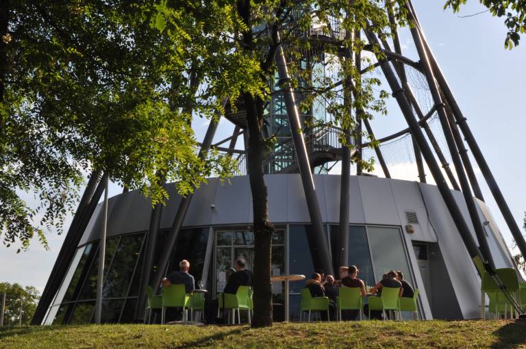 Na najvišjo razgledno ploščad stolpa se lahko udobno popeljete z dvigalom ali pa se povzpnete po 240 stopnicah.