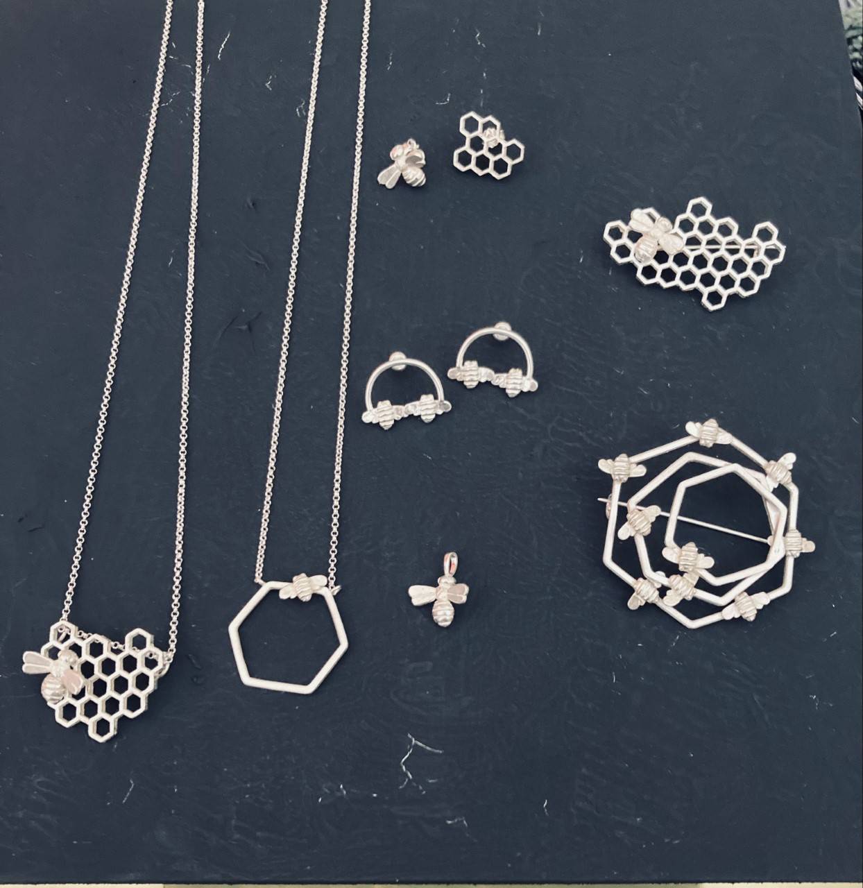 Na broškah, obeskih in uhanih so upodobljene drobne čebelice, nekatere pa krasijo tudi lesene metuljčke.