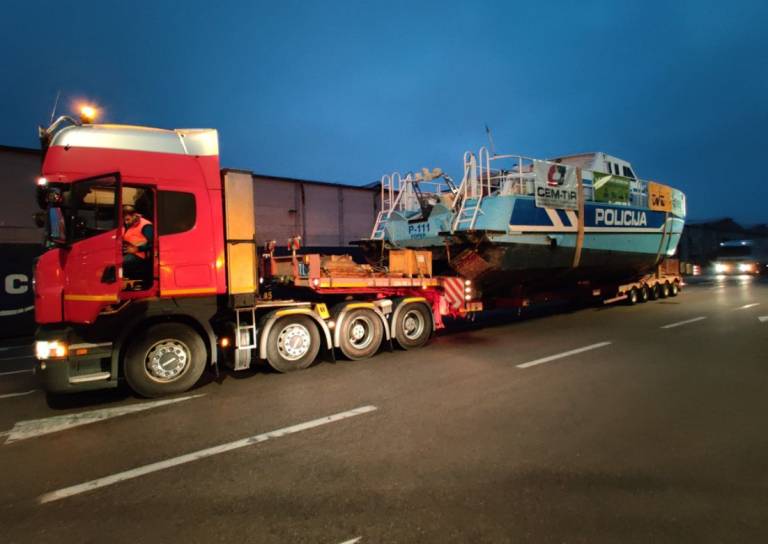 Na svoji zadnji poti je danes najstarejši in največji čoln slovenske policije. Prevažajo ga iz Kopra v Pivko.