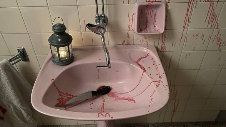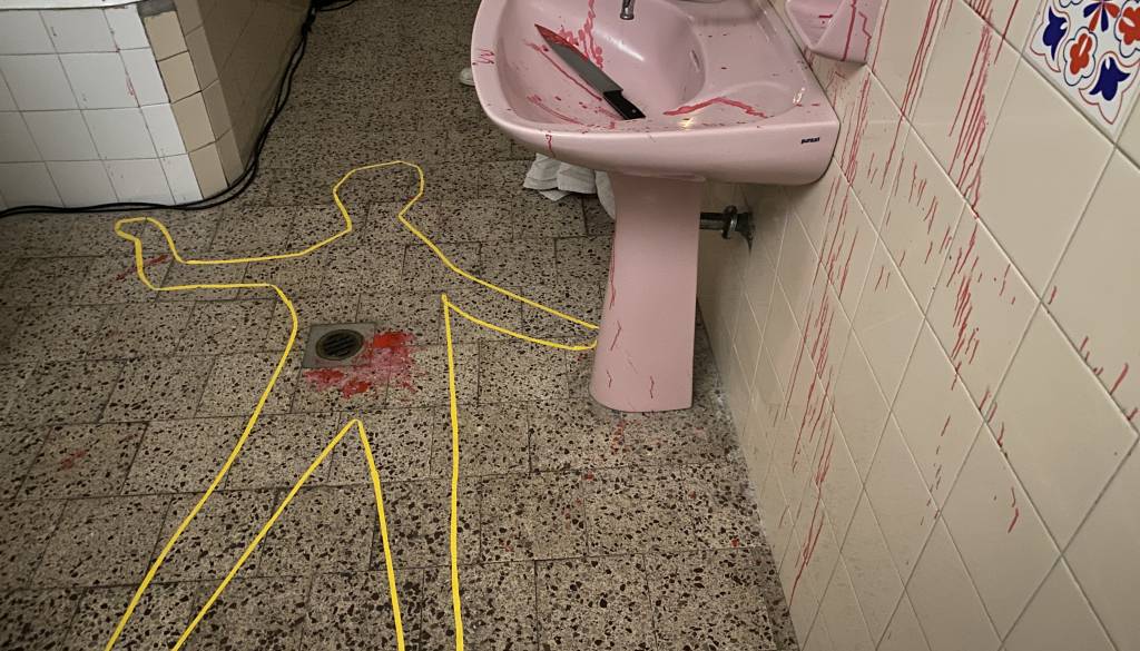V Hišo groze vstopimo skozi prvo sobo, kjer nas pričaka temna kopalnica z grozljivim prizorom, znotraj katere gre za pretresljivo zgodbo o družinskem nasilju nad partnerko.