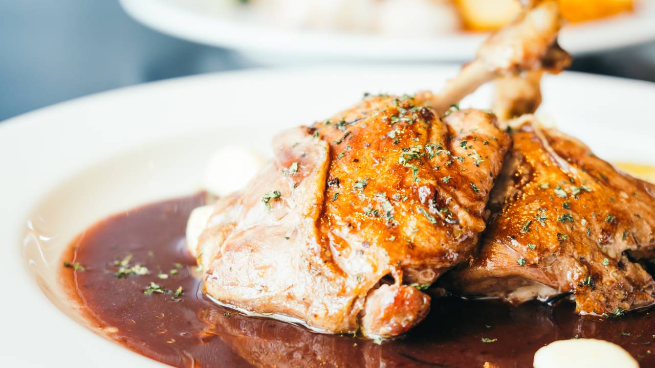 Račje prsi začinimo s soljo in poprom ter jih na vroči ponvi pečemo šest do osem minut na vsaki strani, nato počivajo pet minut in jih narežemo na tanke rezine.