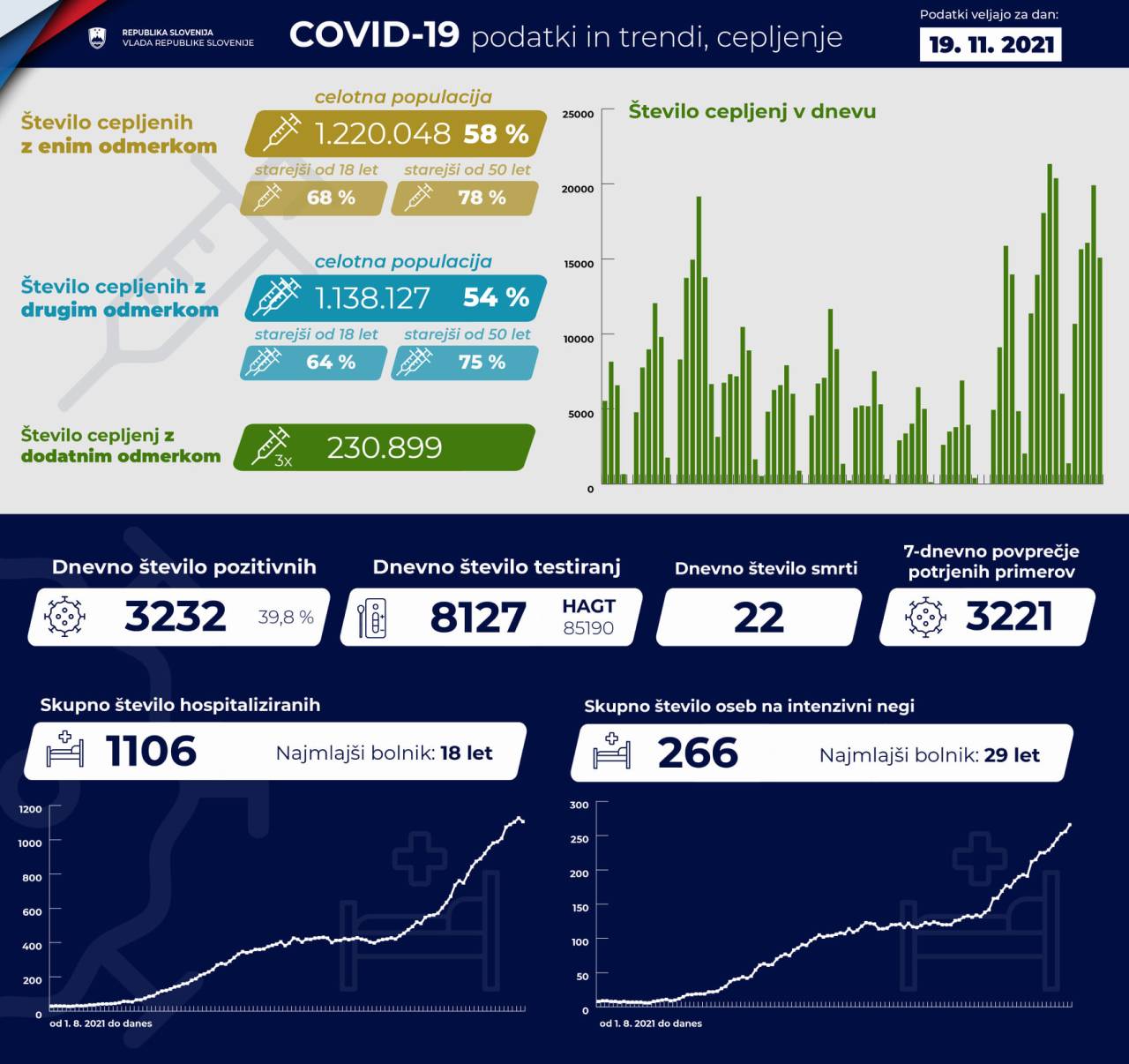 V Sloveniji so včeraj, 19. novembra, opravili 8127 PCR testiranj na koronavirus in potrdili 3232 novih okužb, gre za 39,8-odstotni delež okužb.