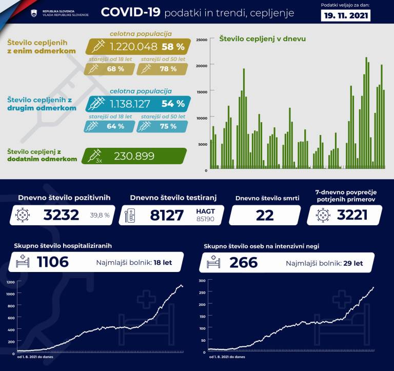 V Sloveniji so včeraj, 19. novembra, opravili 8127 PCR testiranj na koronavirus in potrdili 3232 novih okužb, gre za 39,8-odstotni delež okužb.