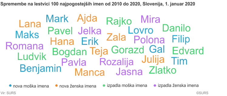 Število imen s frekvenco 20.000 se je zmanjšalo s sedem na tri. Seznama desetih najpogostejših imen sta se spremenila, še vedno pa sta na vrhu Marija in Franc, ugotavlja Statistični urad Republike Slovenije.