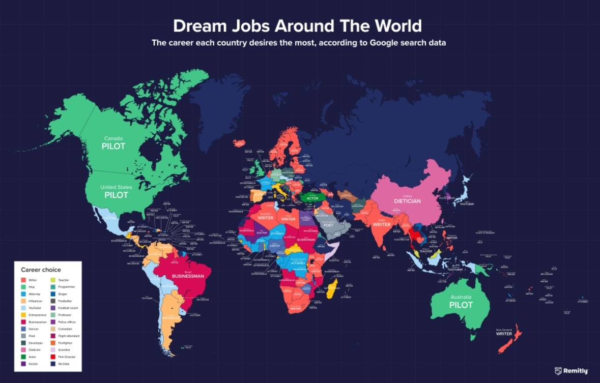 Družba za finančne storitve Remitly je naredila raziskavo sanjskih poklicev in objavila podatke na podlagi globalnih iskanj v Googlu med oktobrom 2021 in oktobrom 2022 s poizvedbo »kako biti ...« prazno mesto zapolnjeno z želeno zaposlitvijo.