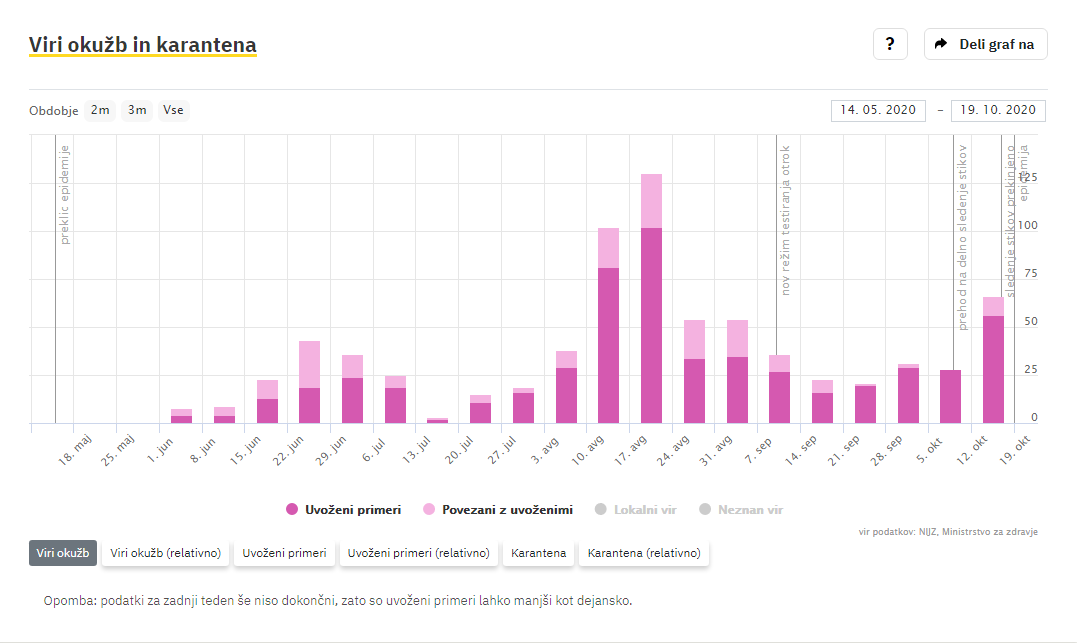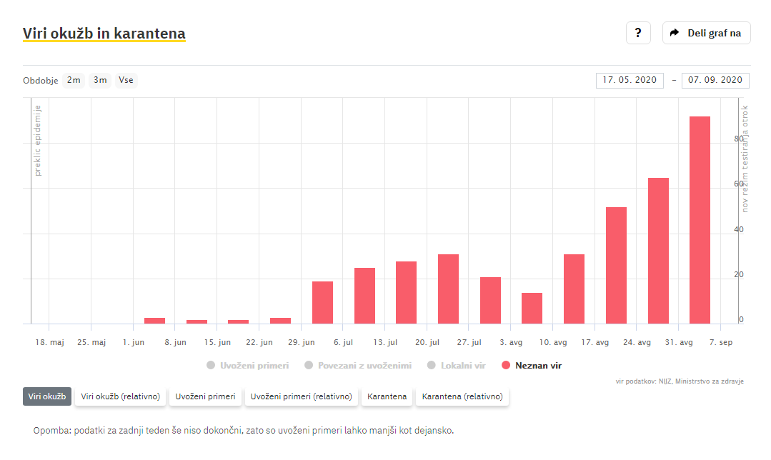 Prišel je avgust, dopustniki so se vračali iz tujine in vedno več je bilo uvoženih primerov, povezanih z okužbo s koronavirusom. V Sloveniji smo zato opazili skok v številu potrjenih primerov in tudi skok v relativnem deležu.