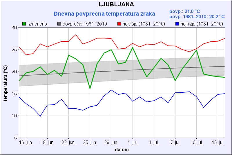 Značilnost zadnjega meseca so temperaturna nihanja s periodo štiri do pet dni. Vremenske fronte redno prehajajo Slovenijo in vedno znova prinesejo dež ter ohladijo ozračje, ampak srednje dnevne temperature 30-dnevnega obdobja pa nikjer niso podpovprečne. Res pa je, da so temperature v tem tednu podpovprečne. Zgodovino meritev najdete tukaj.