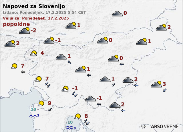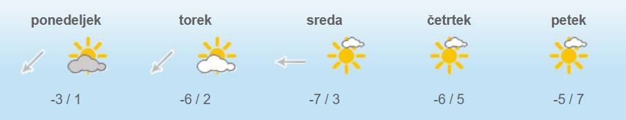 Najnižje jutranje temperature bodo od minus deset do minus pet, na Primorskem od minus štiri do nič, najvišje dnevne od nič do tri, na Primorskem od pet do deset stopinj Celzija.