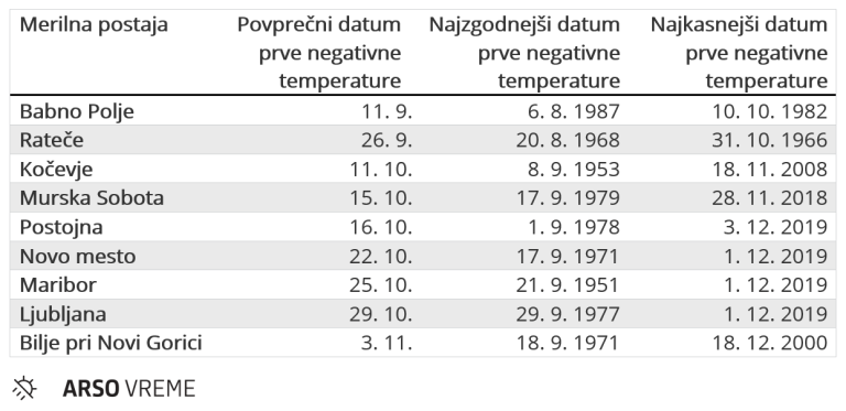 Septembrski »minus« je vsaj v večjem delu Slovenije vedno redkejši, zadnja leta je opazen trend pomikanja prve negativne temperature proti sredini ali koncu novembra, zlasti to velja za mestna središča.