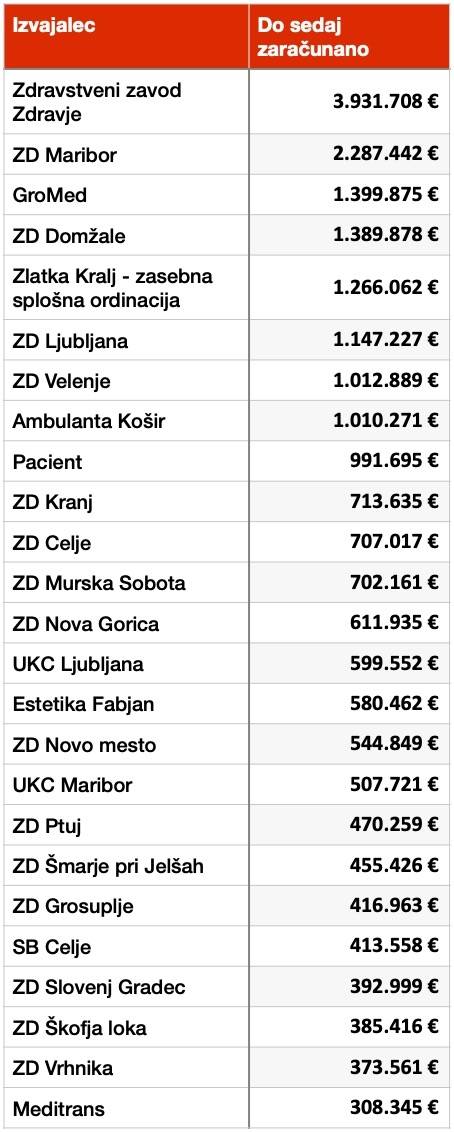 Iz podatkov, ki jih je Necenzurirano pridobil od Zavoda za zdravstveno zavarovanje Slovenije, je razvidno, da je povračilo stroškov zahtevalo 450 javnih in zasebnih izvajalcev. Od lanskega novembra do konca junija je največ državnega denarja, kar 3,9 milijona evrov, dobil zasebni Zdravstveni zavod Zdravje iz Ljubljane.