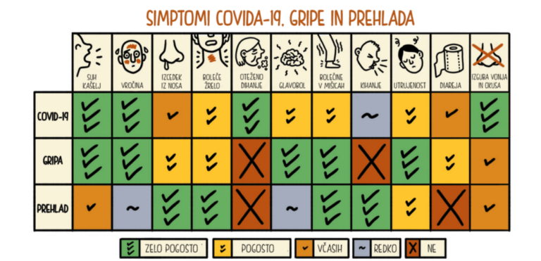 Kljub vsej previdnosti bodimo ves čas pozorni na simptome morebitne okužbe. Najbolj pogosti simptomi okužbe s koronavirusom so vročina, kašelj, splošna utrujenost in izguba vonja ter okusa.