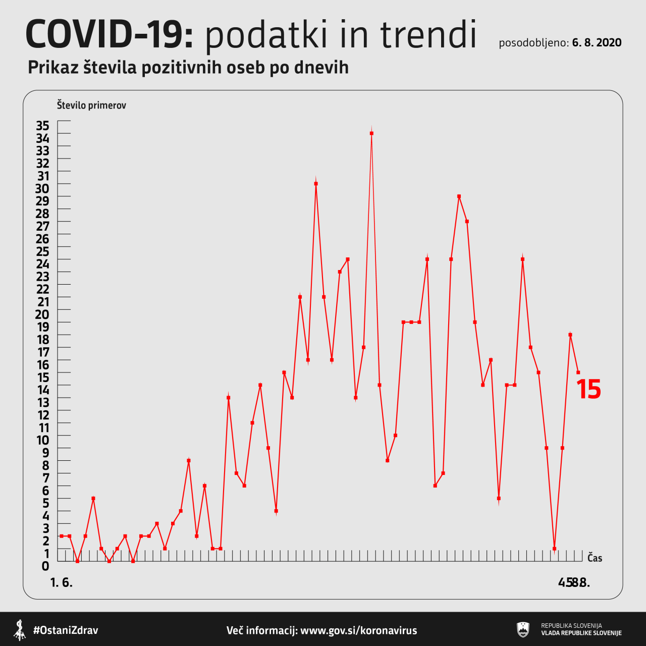 Včeraj, 5. avgusta 2020, so v Sloveniji opravili 771 testiranj na novi koronavirus. Potrdili so 15 novih okužb. Za primerjavo: dan prej so potrdili 18 novih okužb.