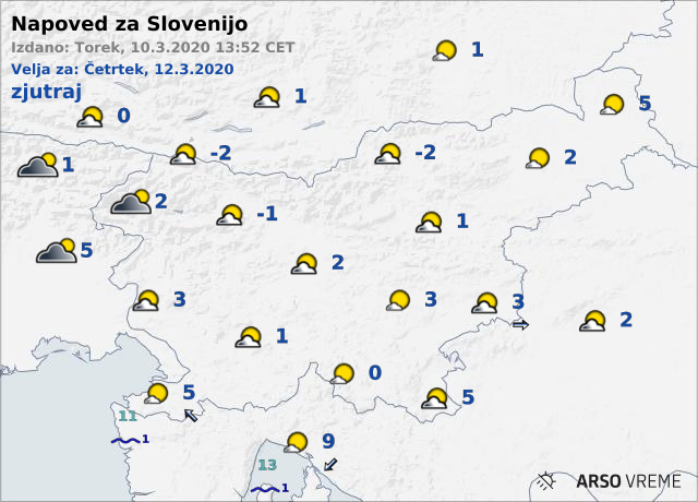 Jutri bo pretežno jasno, na vzhodu zjutraj še bolj oblačno. Zapihal bo jugozahodni veter. Najnižje jutranje temperature bodo od -1 do 6, najvišje dnevne od 14 do 21 stopinj Celzija. V četrtek bo pretežno jasno, pihal bo jugozahodni veter. Proti večeru se bo na zahodu pooblačilo. V petek bo pretežno oblačno, sprva bo občasno deževalo zlasti na zahodu, popoldne pa bodo padavine dosegle tudi vzhodne kraje.