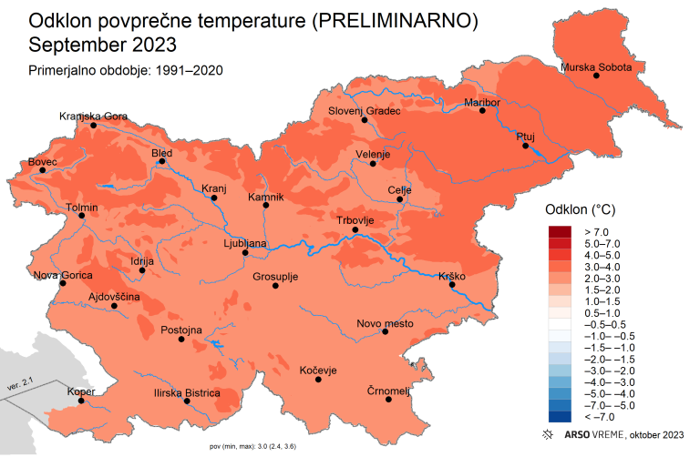 Glede na temperaturni razpon v obdobju 1991–2020 je bil september v Alpah in severovzhodni Sloveniji izjemno topel, drugod pa zelo topel.