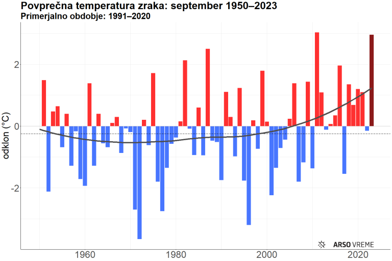 Odklon temperature zraka od povprečja primerjalnega obdobja 1991–2020 je na državni ravni znašal tri stopinje Celzija, kar umešča september 2023 na verjetno drugo mesto najtoplejših vsaj od leta 1950.
