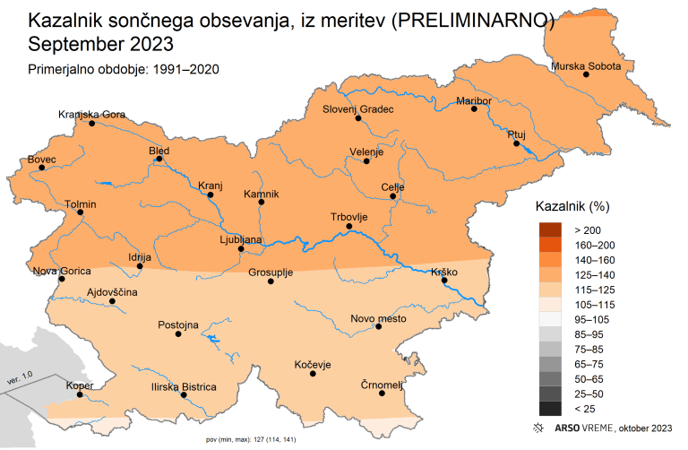 Prostorsko gledano je bil kazalnik osončenosti največji na severu države, kjer je bil nad 130 odstotkov, in se je manjšal proti jugu, kjer je bil tudi pod 115, še kažejo podatki Agencije Republike Slovenije za okolje.