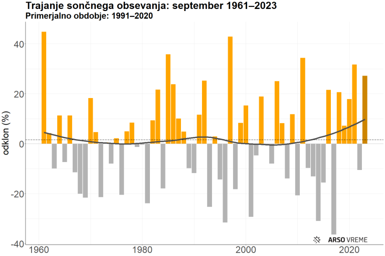 Ob visoki temperaturi zraka in malo padavinah je bilo septembra obilo sončnega vremena. Kazalnik trajanja sončnega obsevanja je na državni ravni znašal 127 odstotkov.
