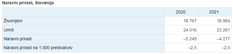 Naravni prirast je v Sloveniji vsako leto od leta 2017 naprej negativen, saj vsako leto umre več prebivalcev, kot se jih rodi. Naravni prirast je bil v letu 2021 pozitiven samo v dveh poletnih mesecih.