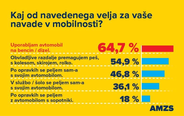 Večina vprašanih uporablja avto, skoraj polovica pravi, da se po opravkih peljejo sami s svojim avtomobilom, več kot tretjina enako pravi za pot v službo ali šolo.